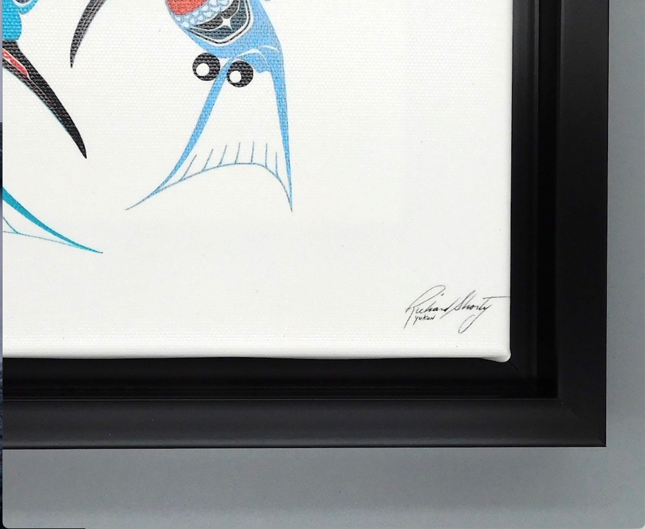 Authentic Indigenous product: An artist's royalty is paid on the sale of this product. Each art work is printed from an original artwork onto fine art canvas, with a bio of the artist included on the reverse. The canvas is framed with a 1 inch composite floater frame that comes complete with a hanging system.