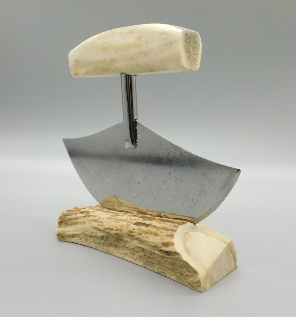 Eastern arctic style uluit (the plural of ulu) are traditional Inuit knives designed to represent the tail of a whale, sometimes they are representative of the shape of the tail, sometimes more triangular. This curved design is extremely useful for the main original purpose of skinning animals after hunting. Uluit were important tools also used by Inuit for other diverse purposes such as cutting hair, chiseling ice or snow, and preparing food. The modern Ulu is the perfect design for chopping herbs in the kitchen. It is said that the knowledge of the ancestor that used the knife would be contained within it, making it stronger, therefore the Uluit were handed down through generations to preserve and strengthen this knowledge. These Uluit are decorative and functional.