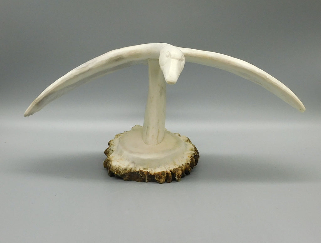 Maureen Morris has developed a very unique craft. Working in antler and bone, Maureen produces beautiful sculptures of considerable brilliance, both in design and in craftsmanship. In her strong graceful bird forms, Maureen demonstrates the carver’s unique ability to see one form inside another. A graduate of the Vancouver School of Art, Maureen initially came to the North to carve jade. However, she soon became fascinated with the potential of antler as a carving medium.