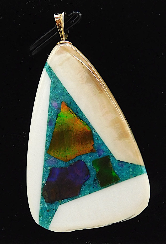 Mosaic art, although known for centuries was a fading art form, until recently. Tom Chant, in his own version of the ancient art of mosaic, complements the natural beauty of the dinosaur bone with the addition of amber, mammoth tusk, and semi-precious stones, creating an original art object of lasting value and elegance.