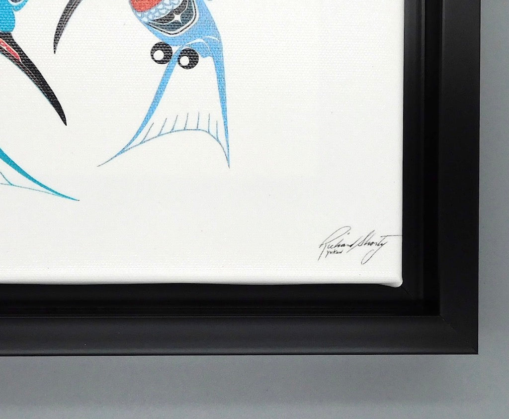 Authentic Indigenous product: The artist is paid a royalty on the sale of this product. Each art work is printed from an original artwork onto fine art canvas, with a bio of the artist included on the reverse. The canvas is framed with a 1 inch composite floater frame that comes complete with a hanging system.