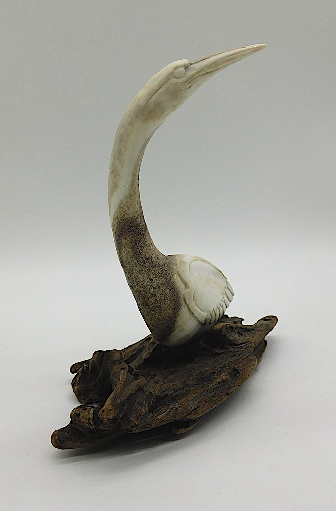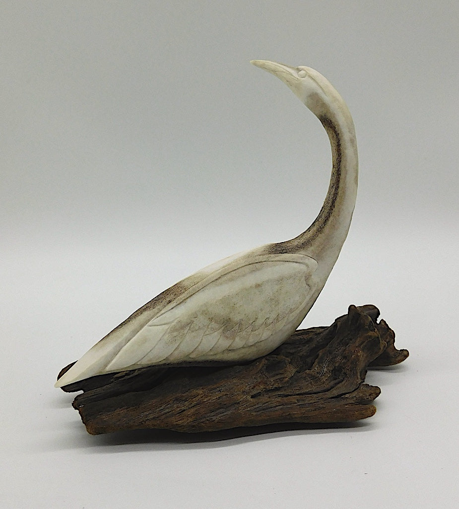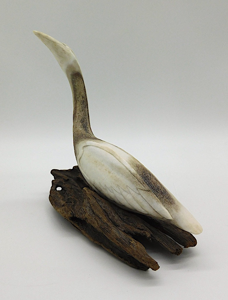 Maureen Morris has developed a very unique craft. Working in antler and bone, Maureen produces beautiful sculptures of considerable brilliance, both in design and in craftsmanship. In her strong graceful bird forms, Maureen demonstrates the carver’s unique ability to see one form inside another. A graduate of the Vancouver School of Art, Maureen initially came to the North to carve jade. However, she soon became fascinated with the potential of antler as a carving medium.