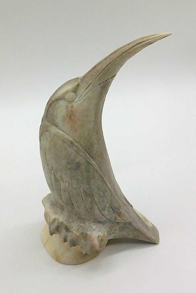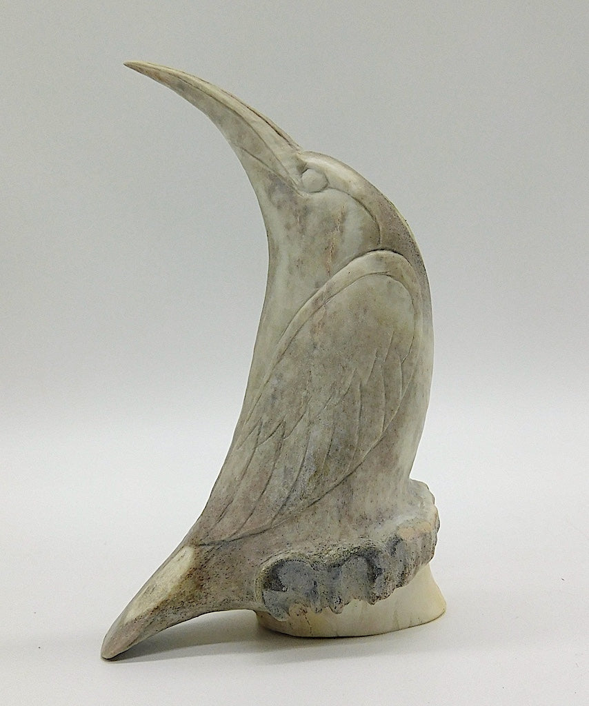 Maureen Morris has developed a very unique craft. Working in antler and bone, Maureen produces beautiful sculptures of considerable brilliance, both in design and in craftsmanship. In her strong graceful bird forms, Maureen demonstrates the carver’s unique ability to see one form inside another. A graduate of the Vancouver School of Art, Maureen initially came to the North to carve jade. However, she soon became fascinated with the potential of antler as a carving medium.