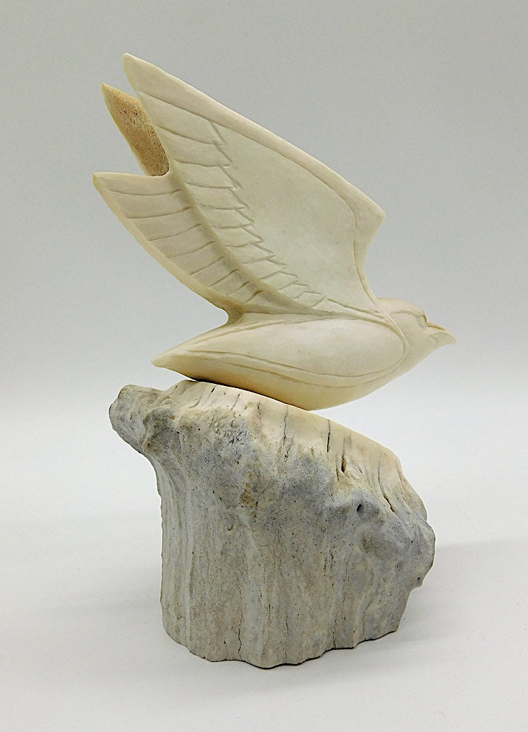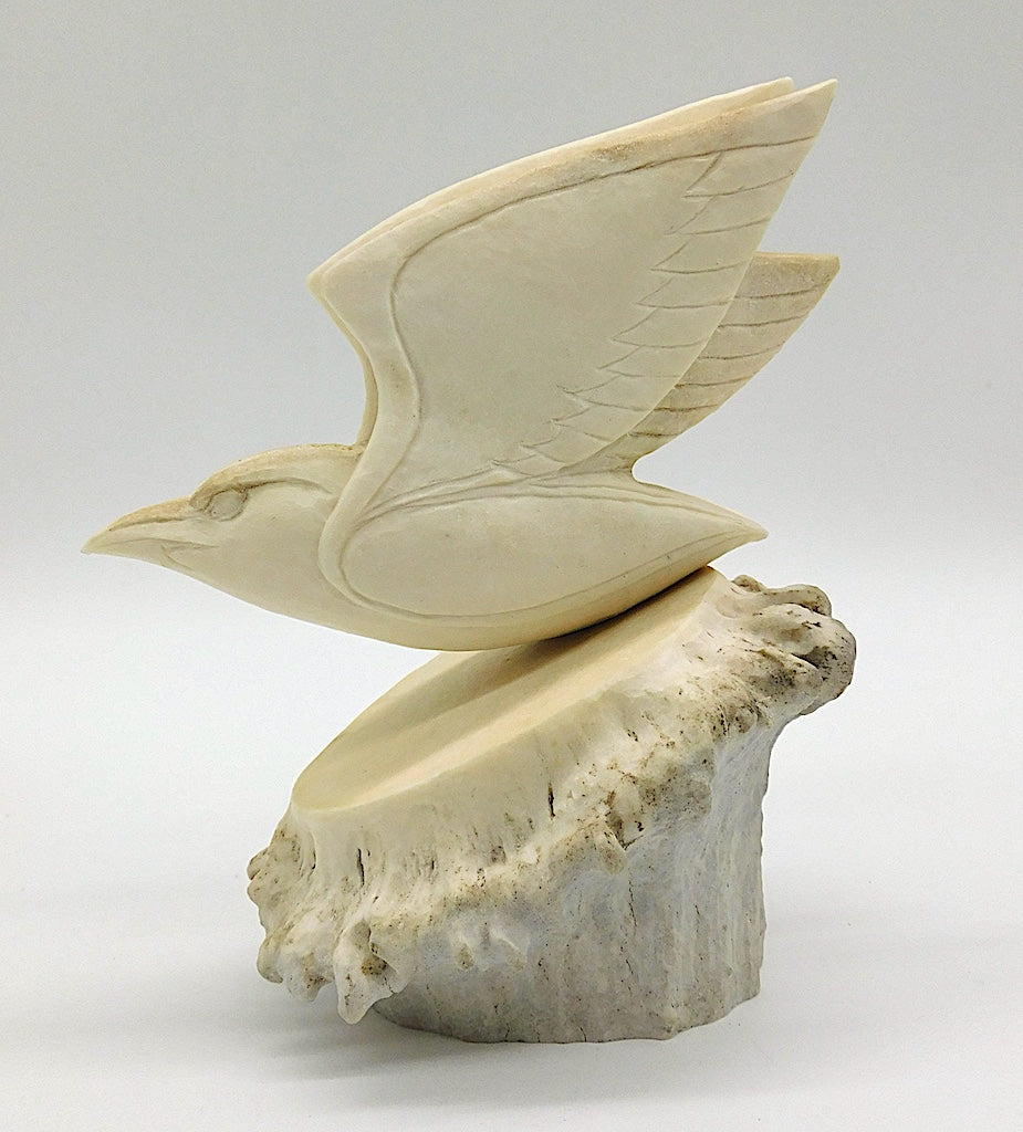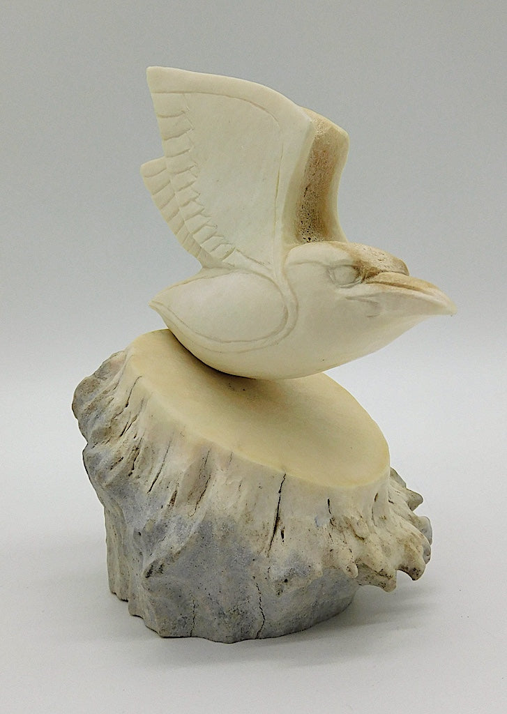 Maureen Morris has developed a very unique craft. Working in antler and bone, Maureen produces beautiful sculptures of considerable brilliance, both in design and in craftsmanship. In her strong graceful bird forms, Maureen demonstrates the carver’s unique ability to see one form inside another. A graduate of the Vancouver School of Art, Maureen initially came to the North to carve jade. However, she soon became fascinated with the potential of antler as a carving medium.
