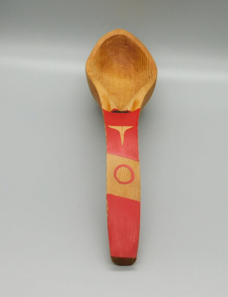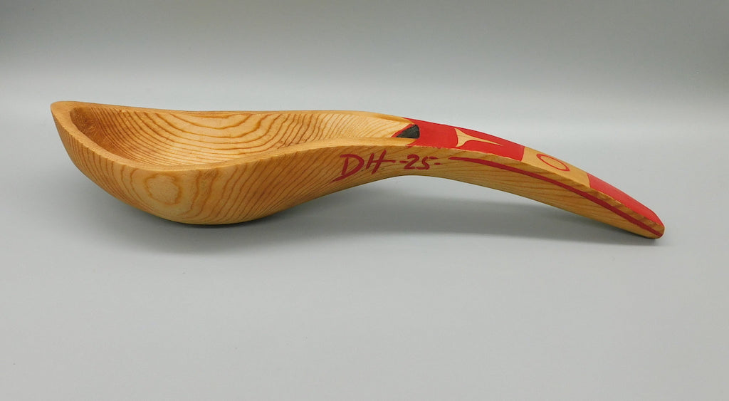 Duran now works primarily in wood, carving paddles, plaques, masks and more. He likes to create his own designs, and uses pencil and acrylic paints. The types of wood he currently uses are basswood, yellow cedar and red cedar.