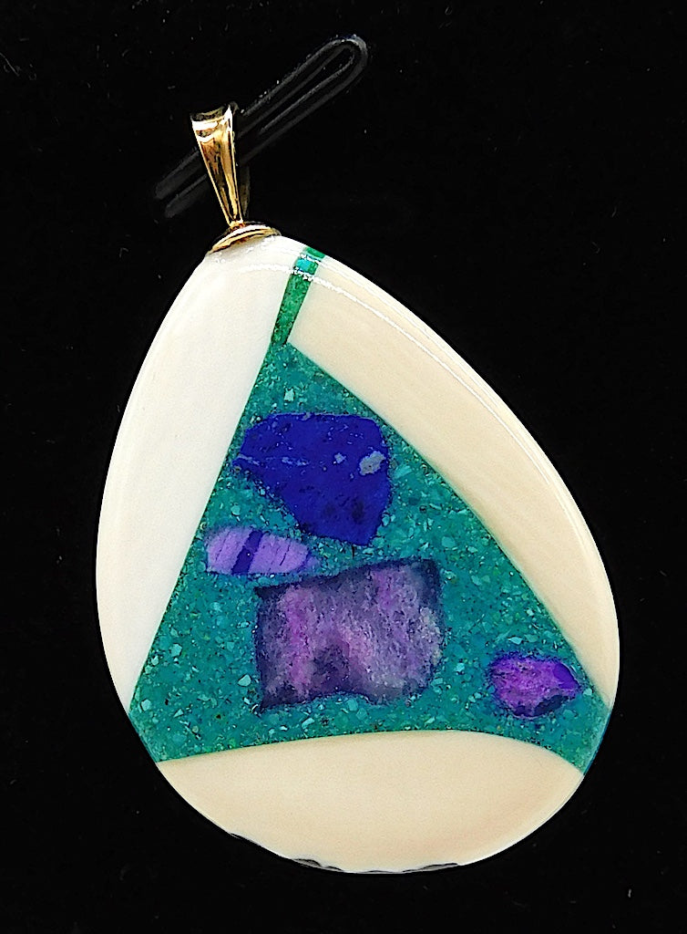 Mosaic art, although known for centuries was a fading art form, until recently. Tom Chant, in his own version of the ancient art of mosaic, complements the natural beauty of the dinosaur bone with the addition of amber, mammoth tusk, and semi-precious stones, creating an original art object of lasting value and elegance.