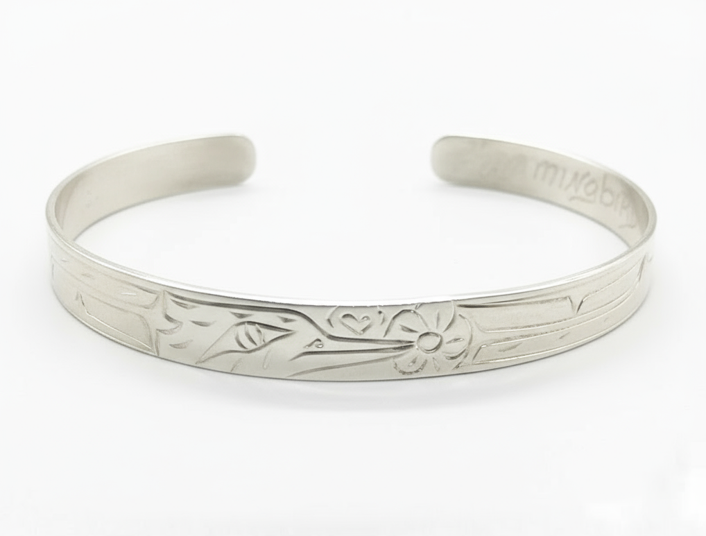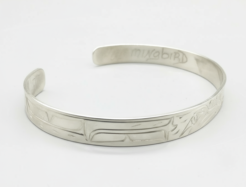 Silver Eagles is a line of North West Coast First Nations jewellery made by Nancy Dawson and Vincent Henson. Nancy is from the Kwaguilth Nation and Vincent is from the Kwa Kwa K'Wak Nation. They live in Victoria, British Columbia. Vincent is Nancy's nephew and she is passing along her knowledge and skill of crafting silver First Nations jewellery. Animals symbolize many things and are very important in Indigenous culture.