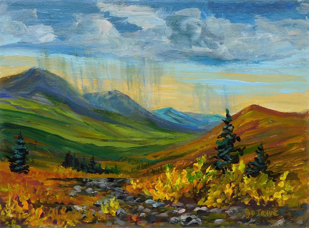 Jackie Irvine is an Artist and Painter from the Yukon. She lives on the Magundy River, four hours northeast of Whitehorse on the Robert Campbell Highway. Living off-grid is a way of life that affords her peace, simplicity and solitude – all an integral part of her creativity. The light, wind, movement and colour of the natural world stimulates her creativity and imagination. She spends most of her time creating original and unique paintings with watercolour, acrylic, and mixed medias.