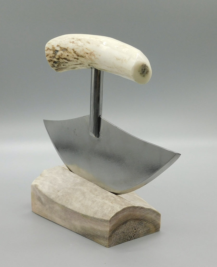 Eastern arctic style uluit (the plural of ulu) are traditional Inuit knives designed to represent the tail of a whale, sometimes they are representative of the shape of the tail, sometimes more triangular. This curved design is extremely useful for the main original purpose of skinning animals after hunting. Uluit were important tools also used by Inuit for other diverse purposes such as cutting hair, chiseling ice or snow, and preparing food. The modern Ulu is the perfect design for chopping herbs in the kitchen. It is said that the knowledge of the ancestor that used the knife would be contained within it, making it stronger, therefore the Uluit were handed down through generations to preserve and strengthen this knowledge. These Uluit are decorative and functional.