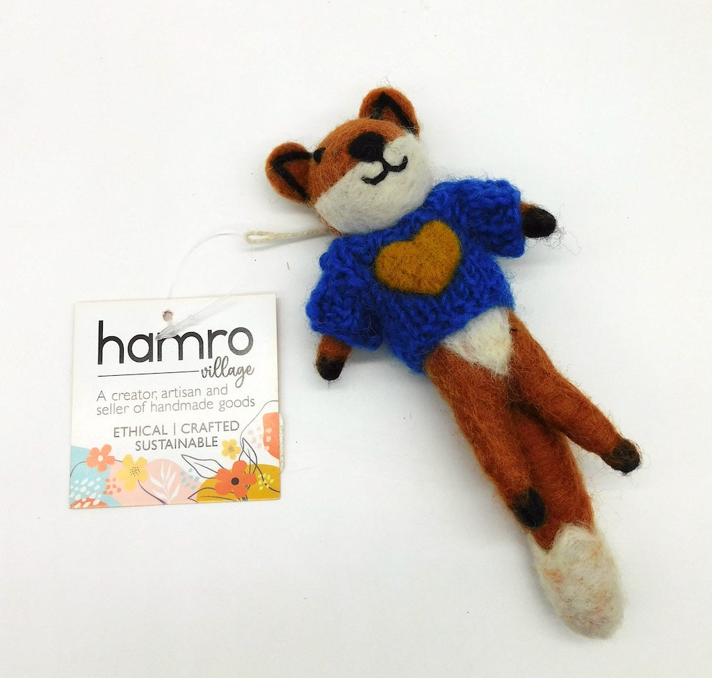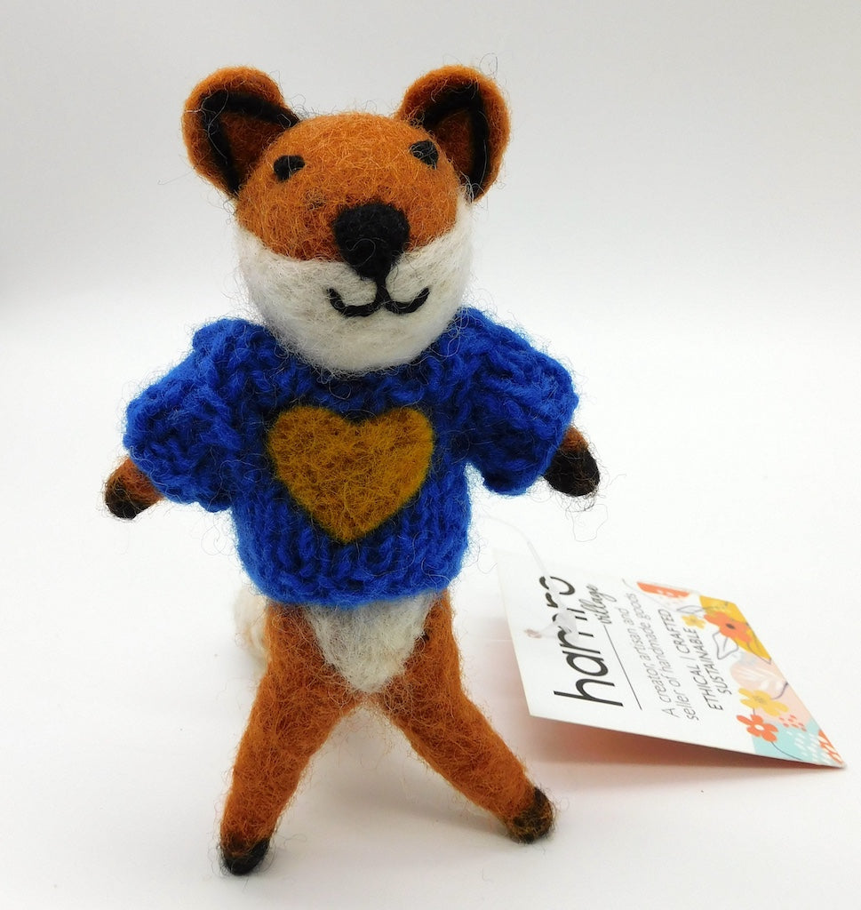 - An adorable felted fox ornament wearing a knit blue sweater with a yellow heart (Ukrainian colours)