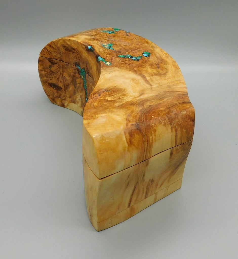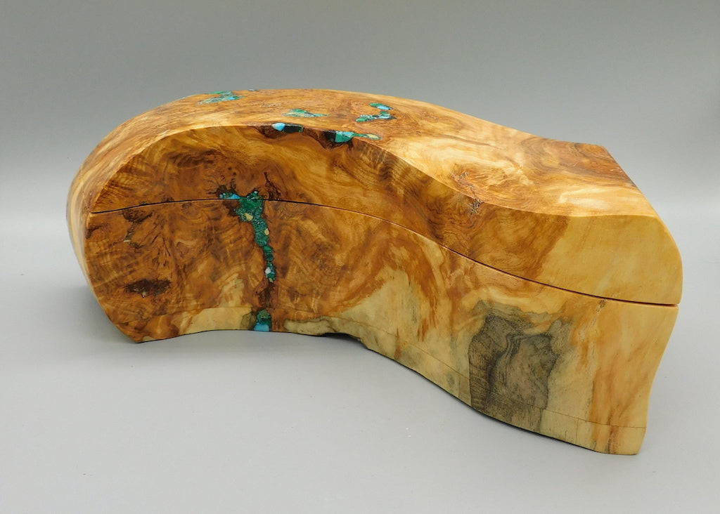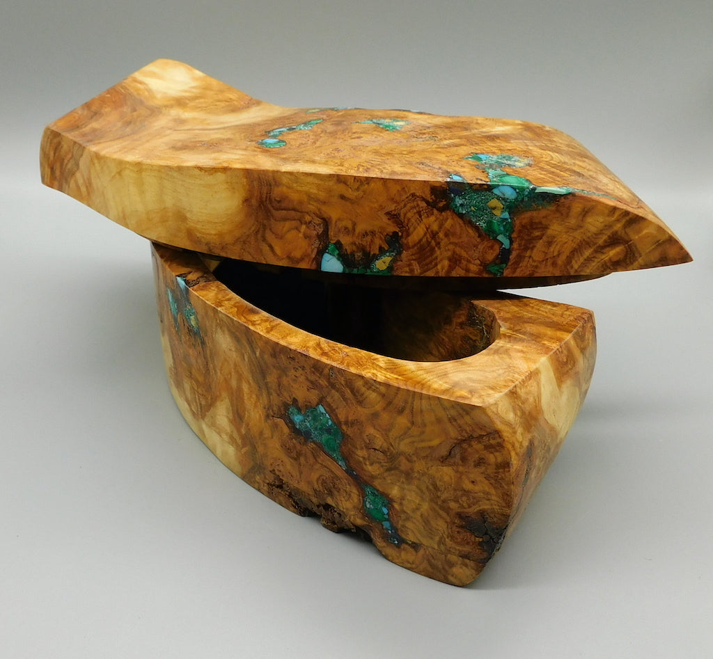Inlaying requires painstakingly fitting small peices of semi-precious stone and metals into the natural gaps in the cut burl. The finished design must then be sanded and waxed many times to create a look and feel that is seamless and natural looking.