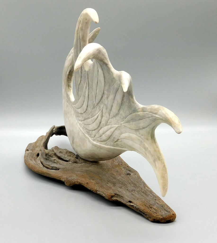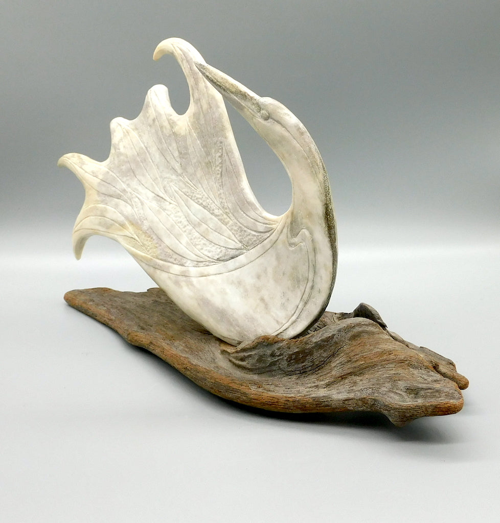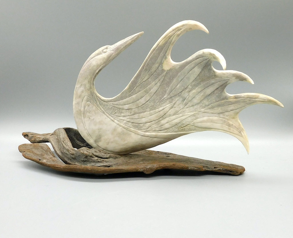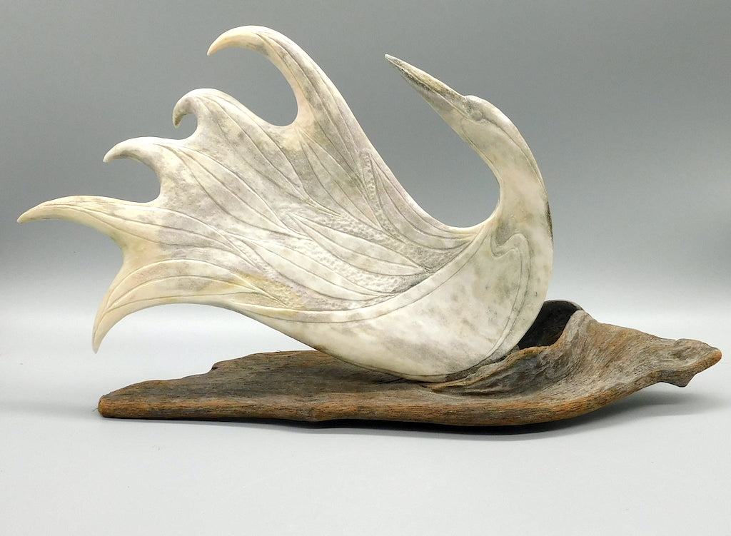 Maureen Morris has developed a very unique craft. Working in antler and bone, Maureen produces beautiful sculptures of considerable brilliance, both in design and in craftsmanship. In her strong graceful bird forms, Maureen demonstrates the carver’s unique ability to see one form inside another. A graduate of the Vancouver School of Art, Maureen initially came to the North to carve jade. However, she soon became fascinated with the potential of antler as a carving medium.