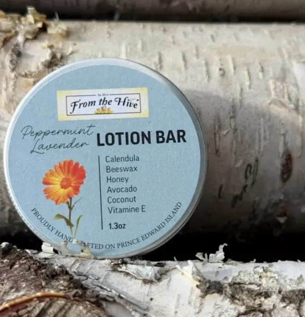 Our Peppermint/Lavender lotion bar has a light moisturizing base of Calendula, Unpasteurized honey, Avocado, Coconut, Pure beeswax and Vitamin E.  to help nourish your skin and with added pure essential oils of peppermint and lavender.