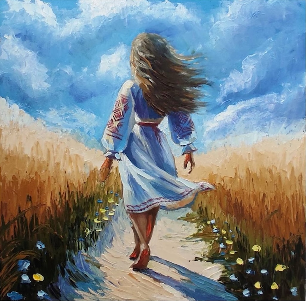 Ukrainian Girl in Wheat Field - Original Painting - Olya - 12x12